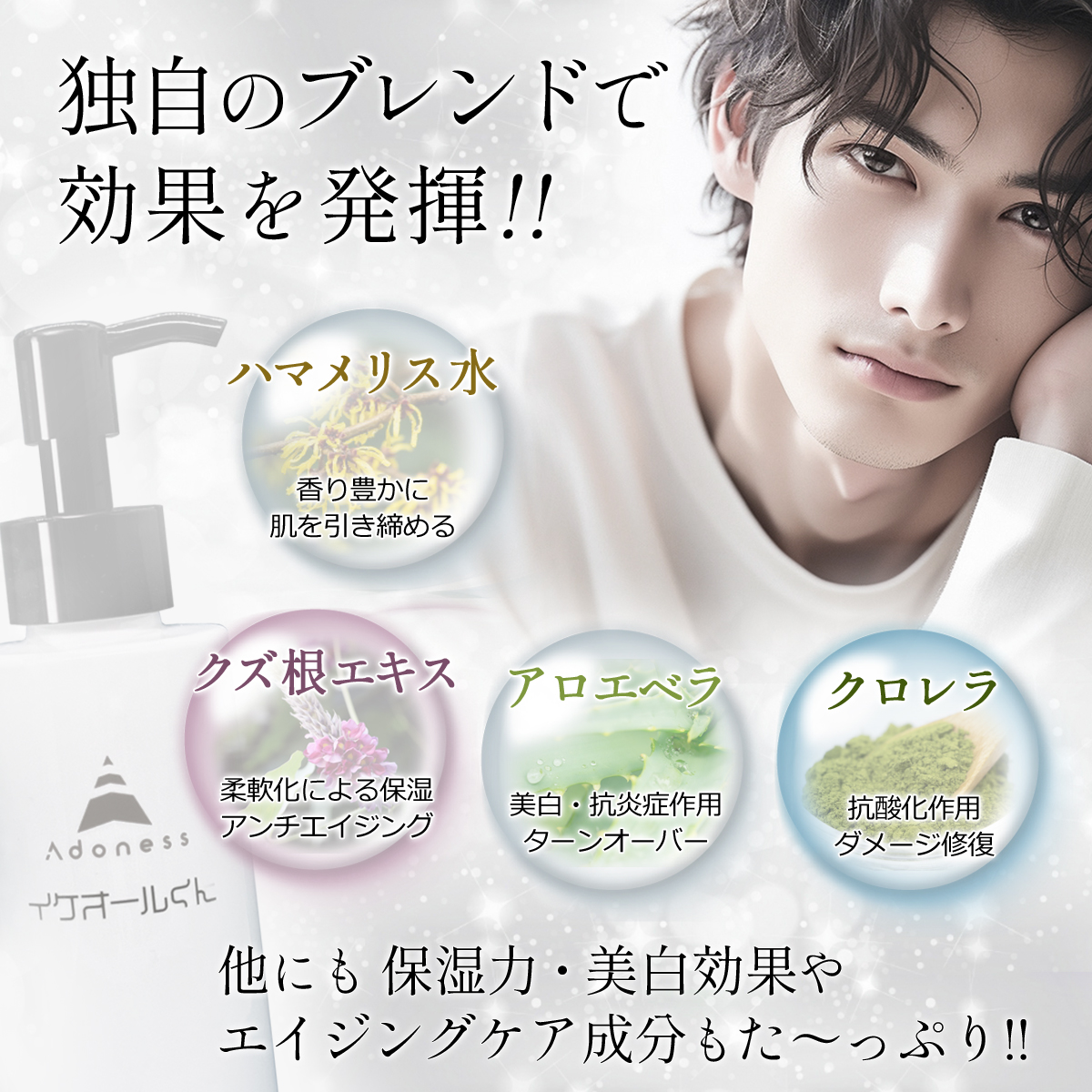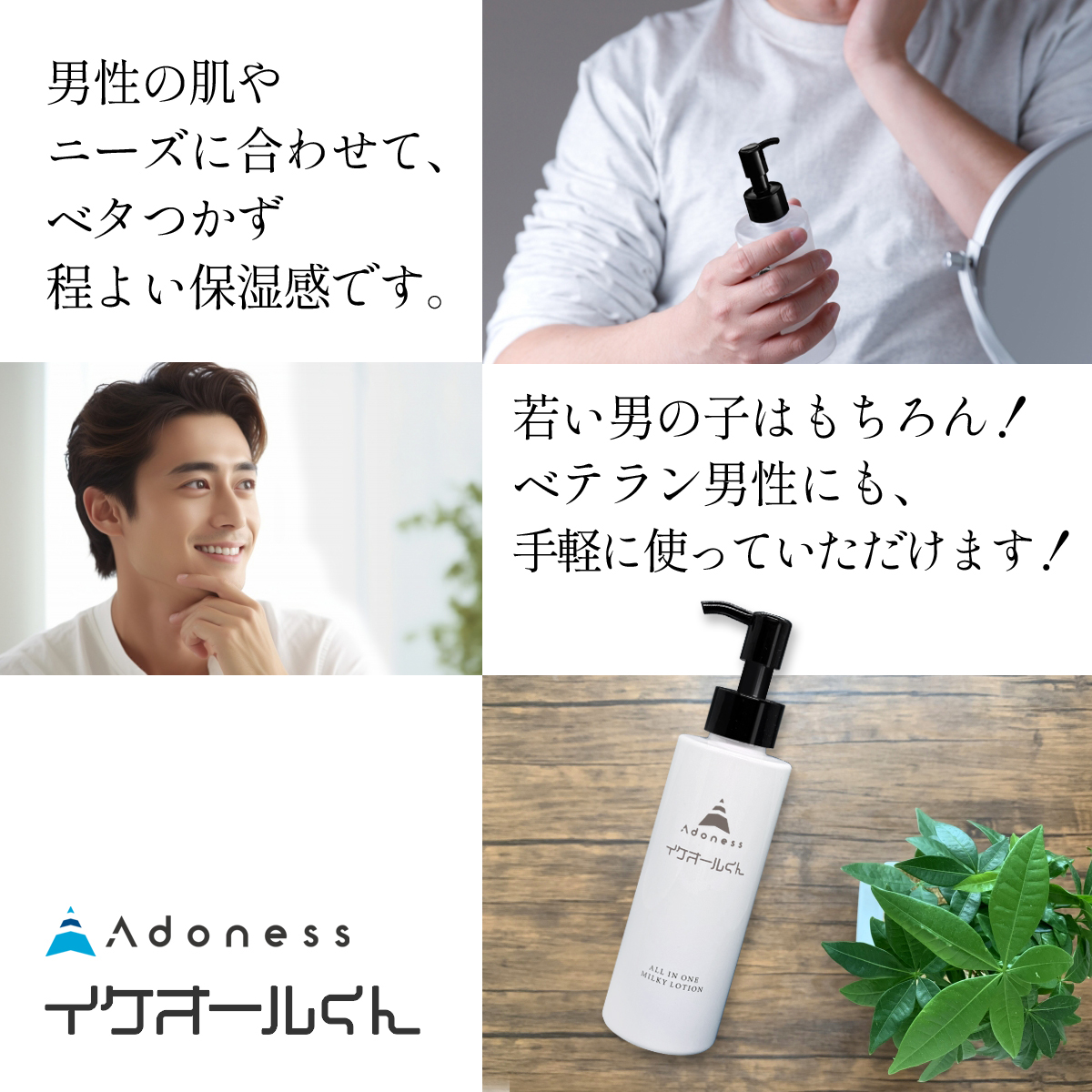 男性の肌やニーズに合わせて、ベタつかず程よい保湿感です。 若い男の子はもちろんのこと!ベテラン男性にも手軽に使っていただけます!