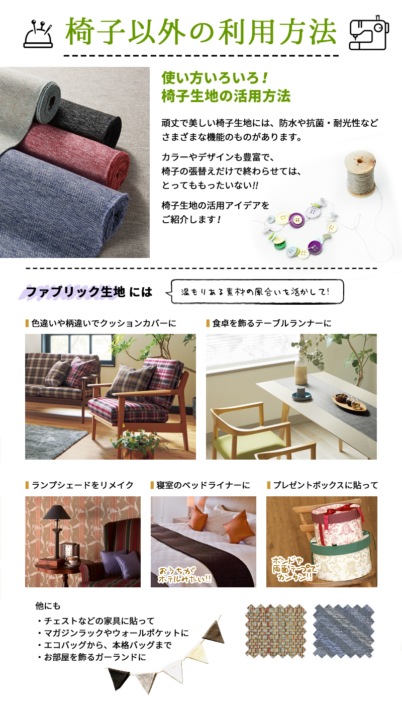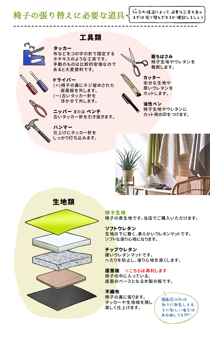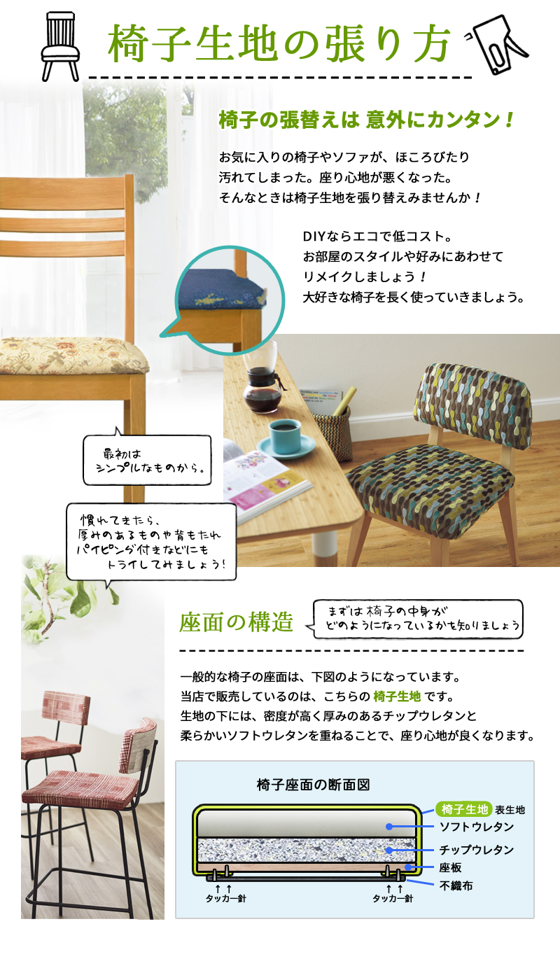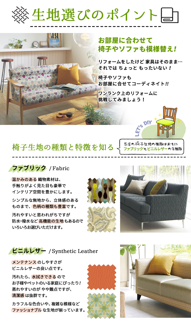 【椅子生地】と【張替え】の説明ページ